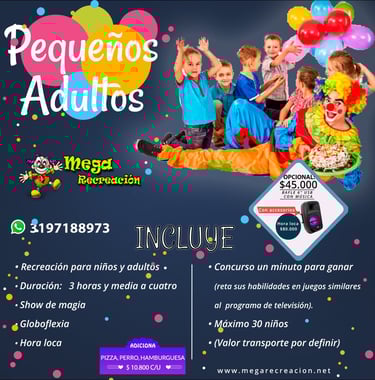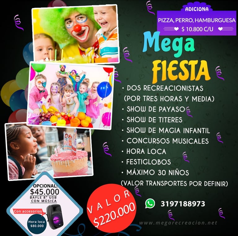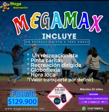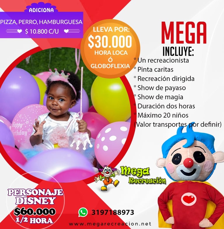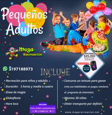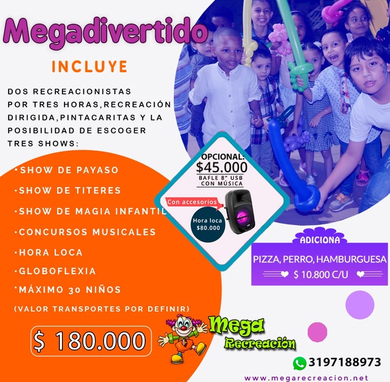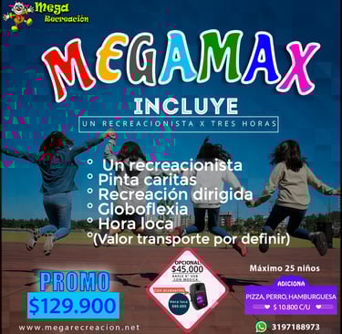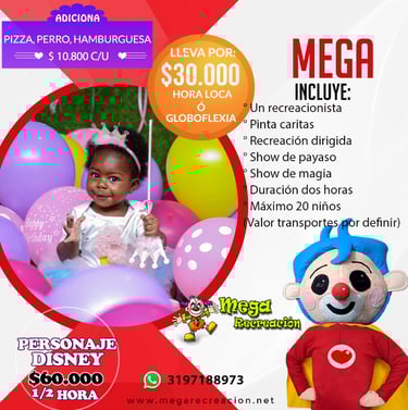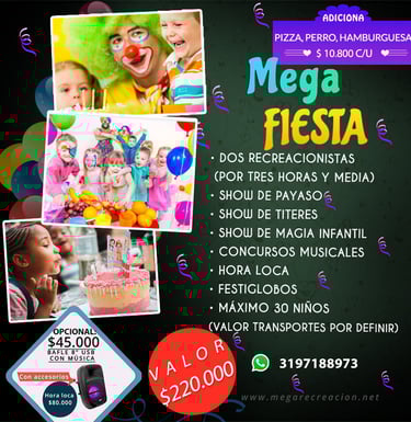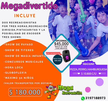 El paquete Mega incluye un recreacionista, pintacaritas para los niños, recreación para niños y adultos, un show de payaso y un show de magia infantil, todo diseñado para ofrecer 2 horas y media de entretenimiento ininterrumpido. Precio: $120,000 pesos + transporte.